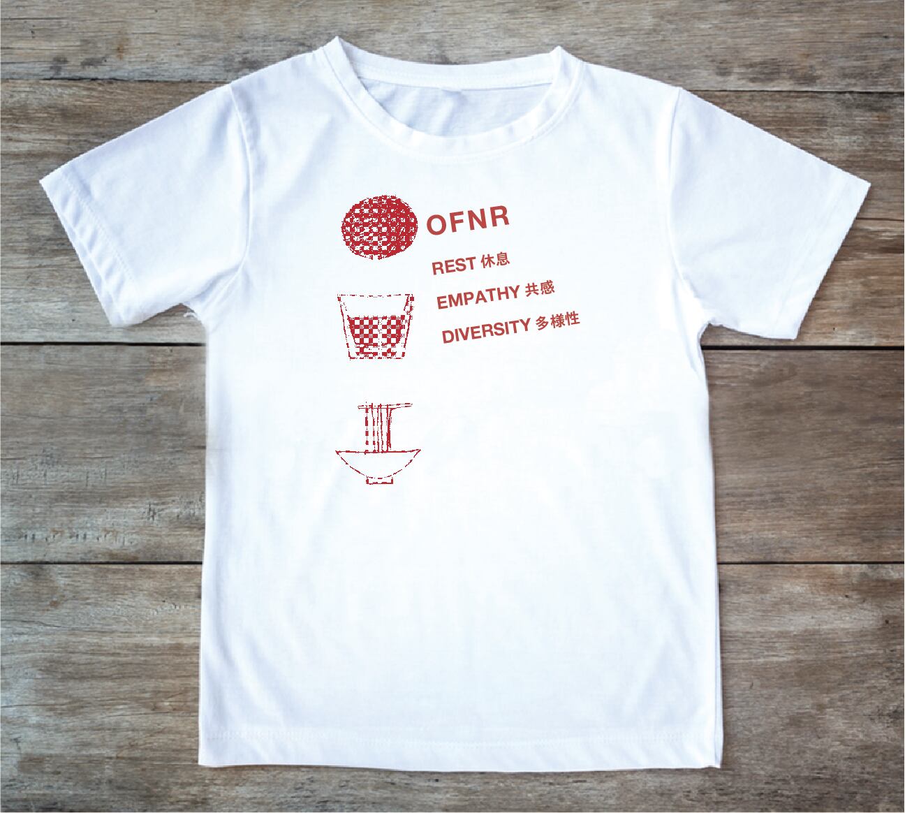 大切にしたいことばにイラストを添えてレイアウトしたデザイン。クッキーで休息、共感でこころのコップを満たそう、世界中の多様なヌードルに敬意を。